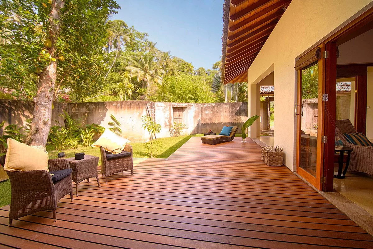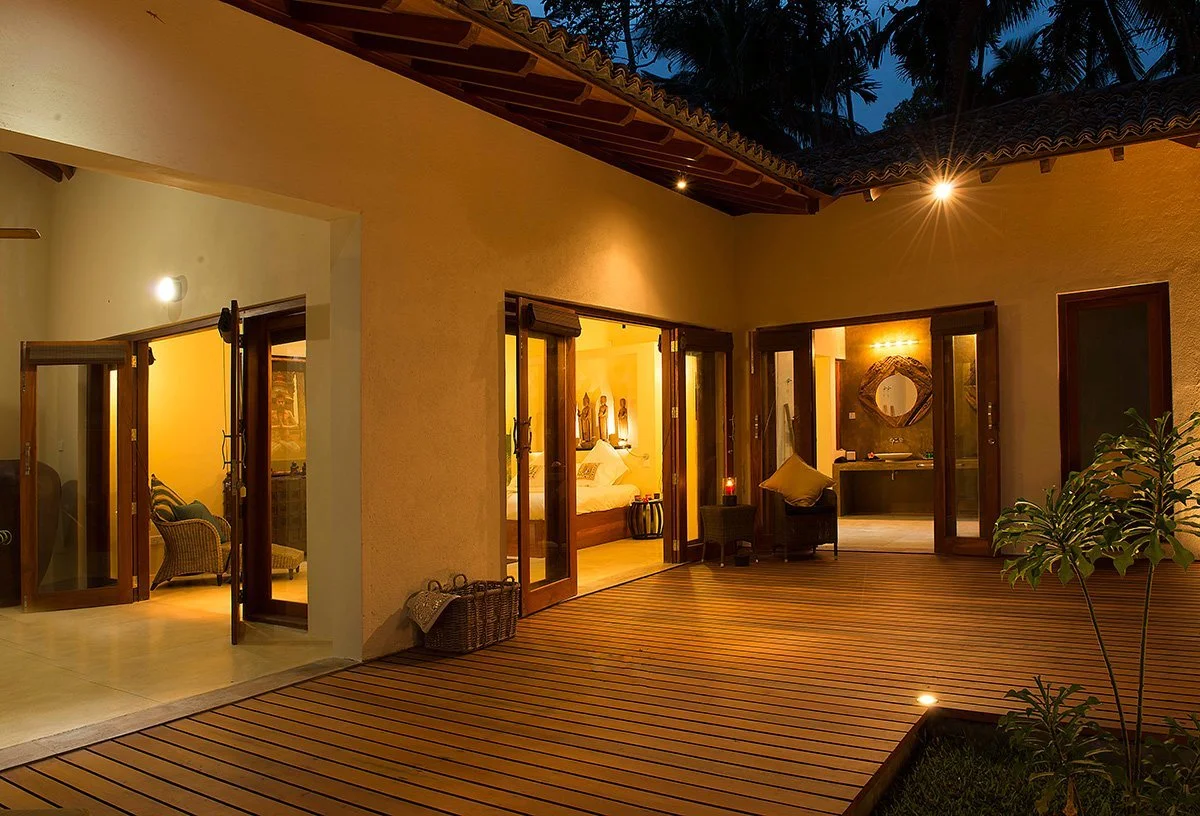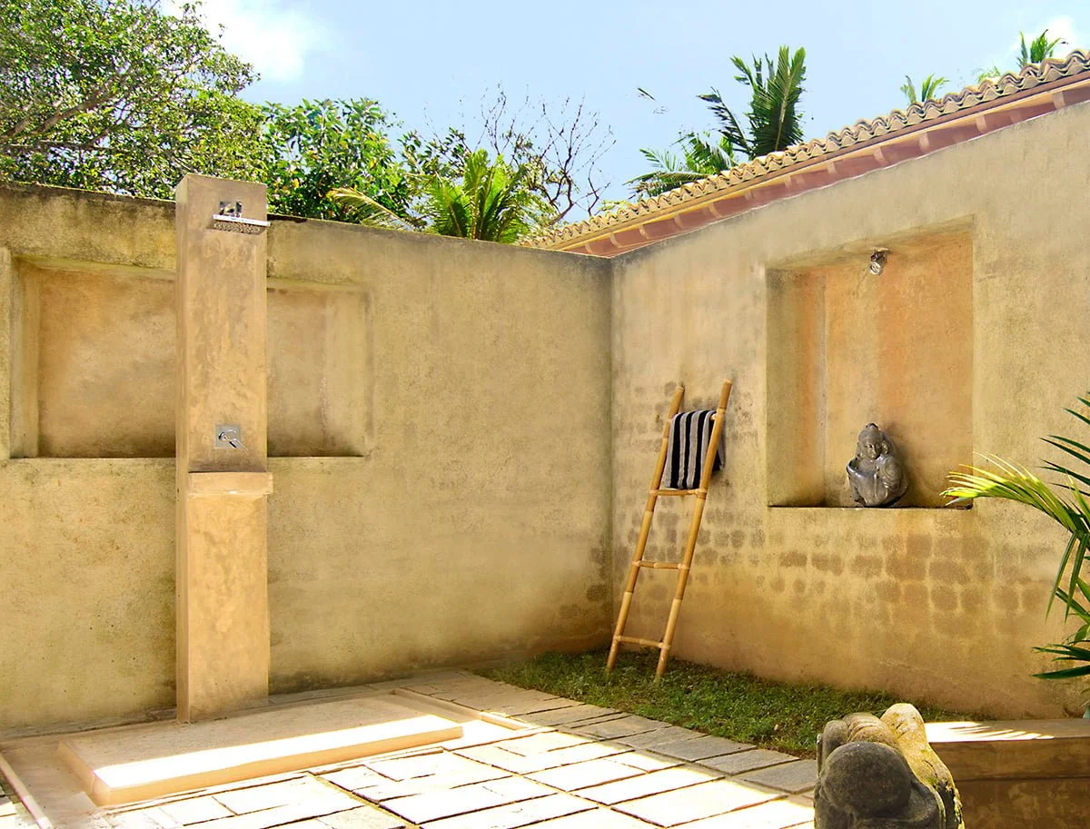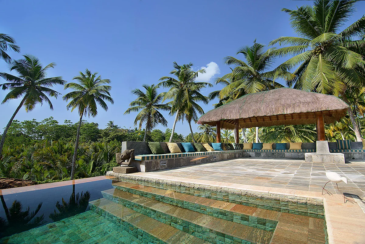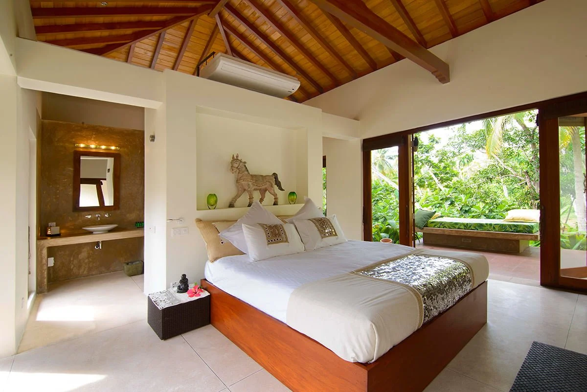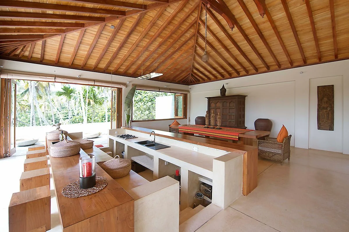 Kumara Villa is a tropical paradise at its best. Modern, luxurious and yet retaining a distinctive traditional charm in its architecture, layout and design, the villa is an ideal base to enjoy a slightly off the beaten track holiday with lush greenery and local attractions for. The villa enjoys a slightly elevated setting, allowing guests to take in the beautiful views of the swaying palms. Kumara Villa itself is made up of open plan pavilions. The three king size bedroom suites are set in their own walled gardens and have their own indoor/ outdoor bathing facilities. Besides, they also have large private terraces fronting the stunning tropical views. The main living pavilion has bi-fold doors and windows and opens into the beautifully landscaped gardens and the large decked saltwater pool area. Kumara villa has a fully staffed kitchen, which is located separately from the main living room and dining pavilion. The open plan dining room has a 12 ft table with 8 chairs and bifold doors and windows allowing in the tropical breeze. The living area is comfortably fitted for relaxing, socializing and entertaining. It overlooks the lush tropical gardens on one side and the shimmering saltwater pool on the other. Sun loungers decorate the poolside. There is also a pergola with shaded and cushioned seating under an antique fan. The villa is fully serviced by cooks, house girls, pool attendant, 24 hr security and a private guest manager.