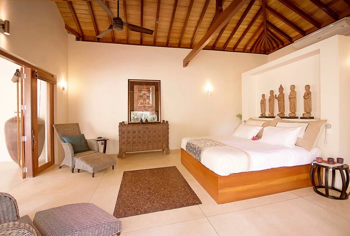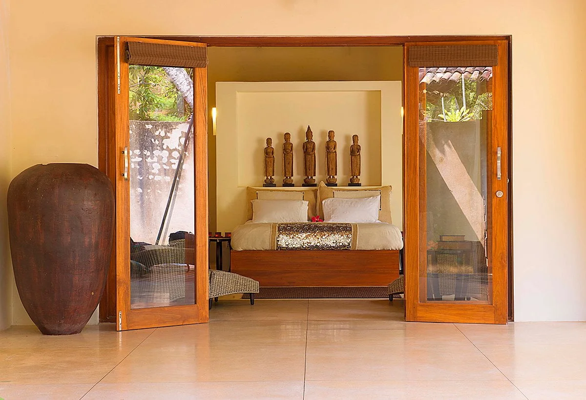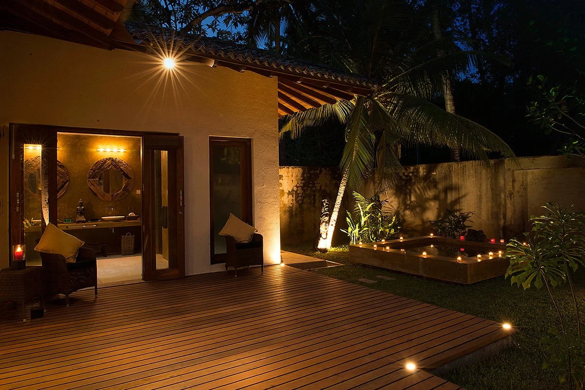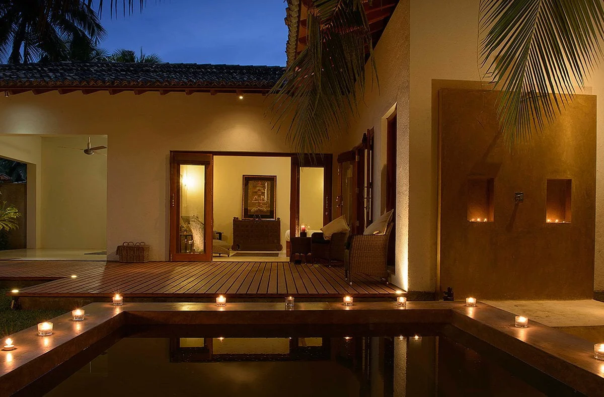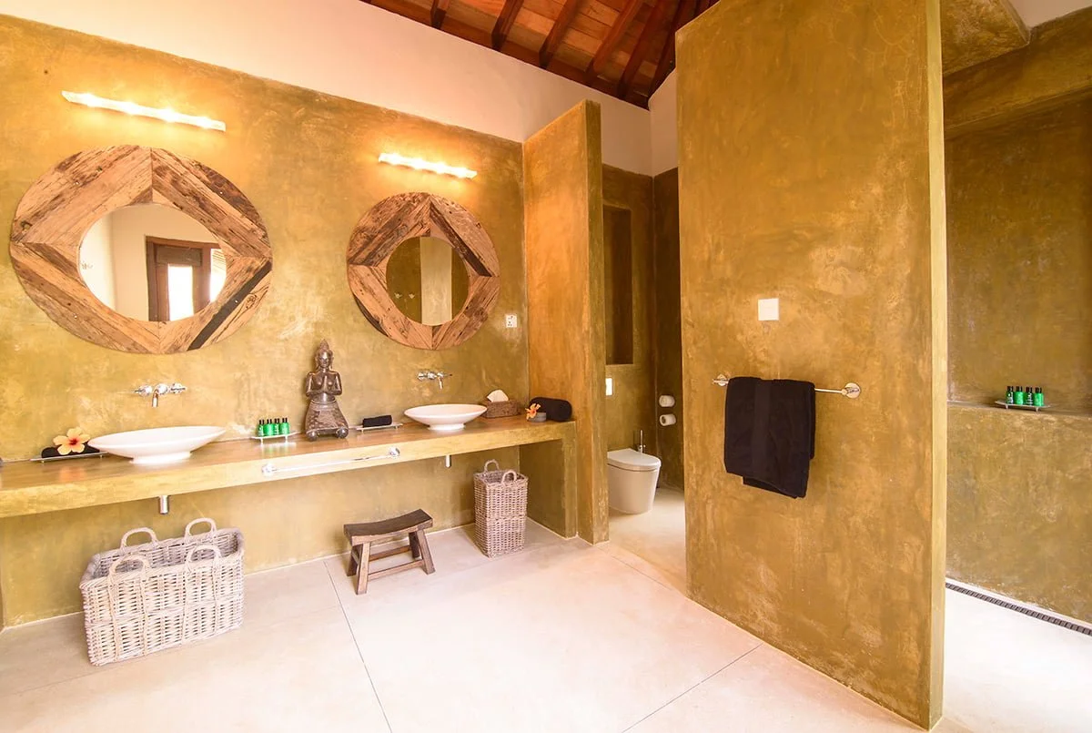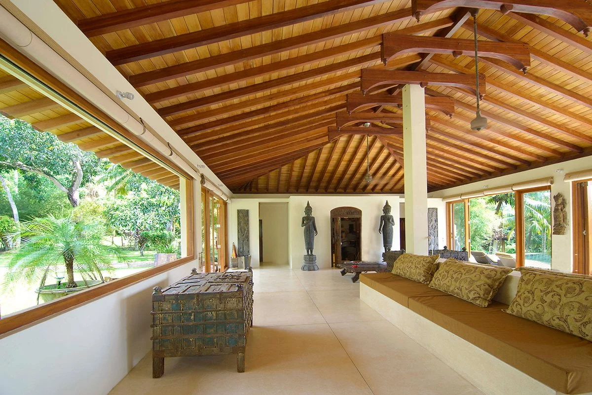 Kumara Villa is a tropical paradise at its best. Modern, luxurious and yet retaining a distinctive traditional charm in its architecture, layout and design, the villa is an ideal base to enjoy a slightly off the beaten track holiday with lush greenery and local attractions for. The villa enjoys a slightly elevated setting, allowing guests to take in the beautiful views of the swaying palms. Kumara Villa itself is made up of open plan pavilions. The three king size bedroom suites are set in their own walled gardens and have their own indoor/ outdoor bathing facilities. Besides, they also have large private terraces fronting the stunning tropical views. The main living pavilion has bi-fold doors and windows and opens into the beautifully landscaped gardens and the large decked saltwater pool area. Kumara villa has a fully staffed kitchen, which is located separately from the main living room and dining pavilion. The open plan dining room has a 12 ft table with 8 chairs and bifold doors and windows allowing in the tropical breeze. The living area is comfortably fitted for relaxing, socializing and entertaining. It overlooks the lush tropical gardens on one side and the shimmering saltwater pool on the other. Sun loungers decorate the poolside. There is also a pergola with shaded and cushioned seating under an antique fan. The villa is fully serviced by cooks, house girls, pool attendant, 24 hr security and a private guest manager.