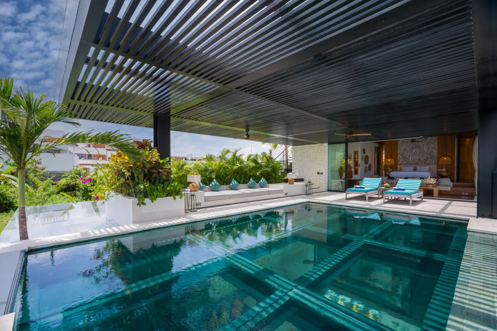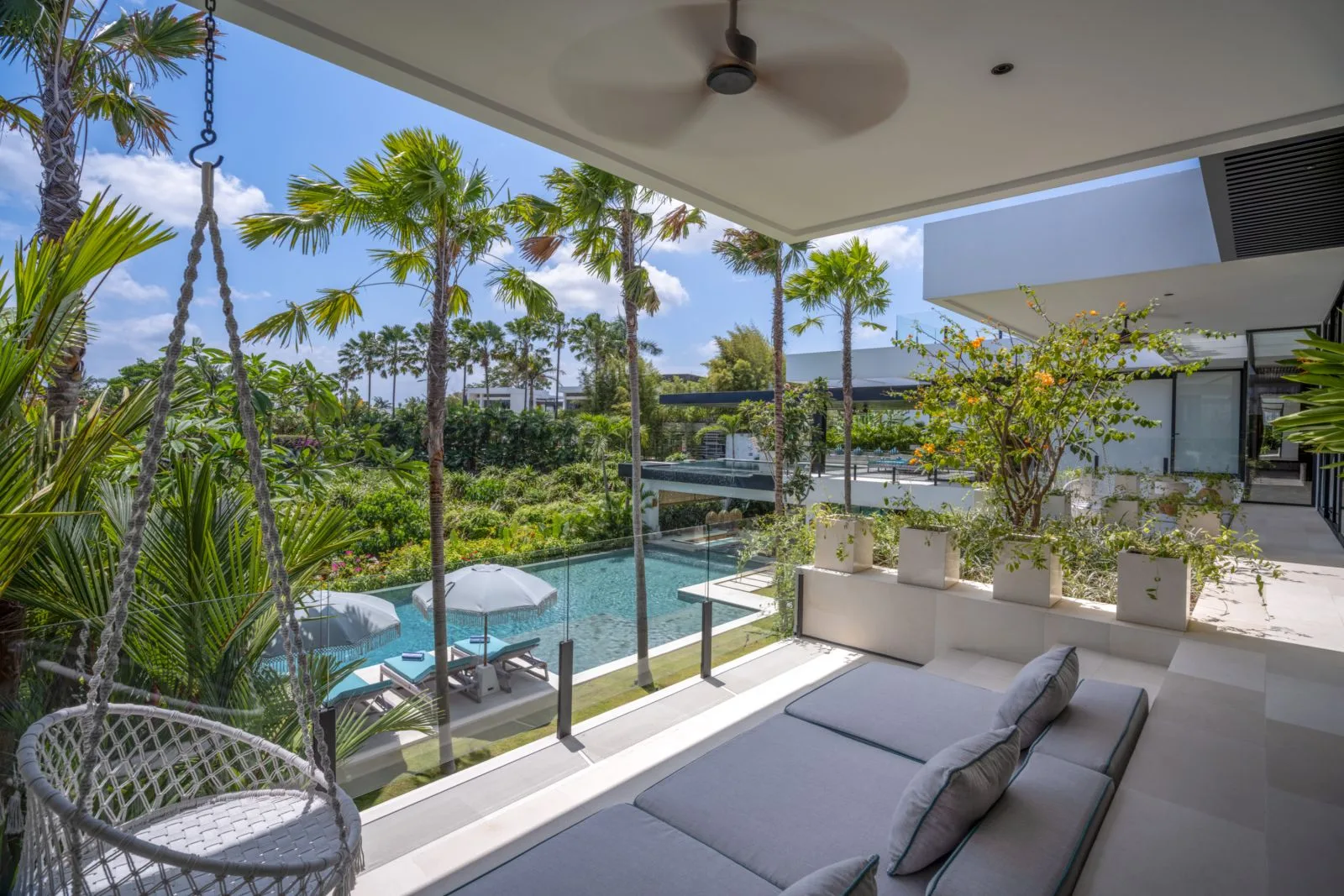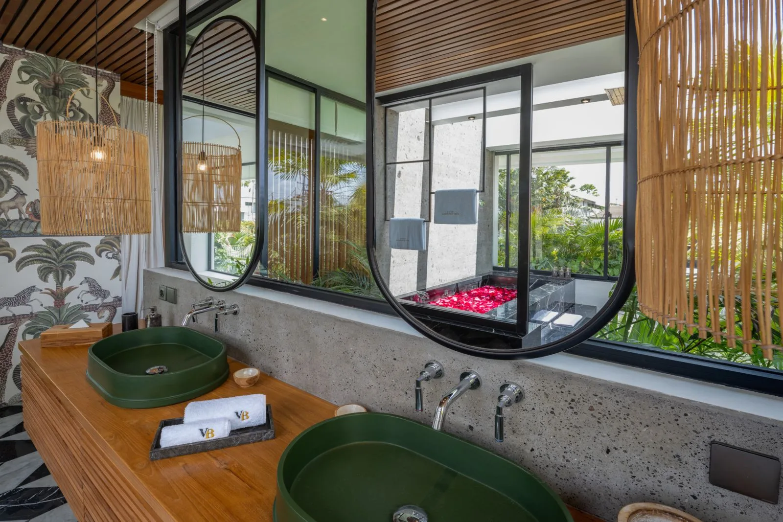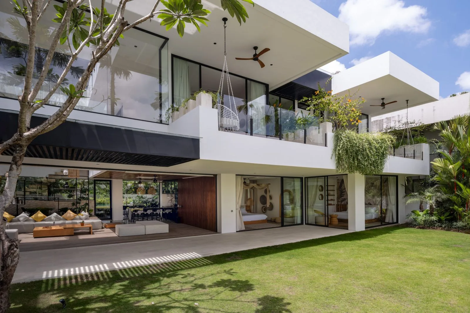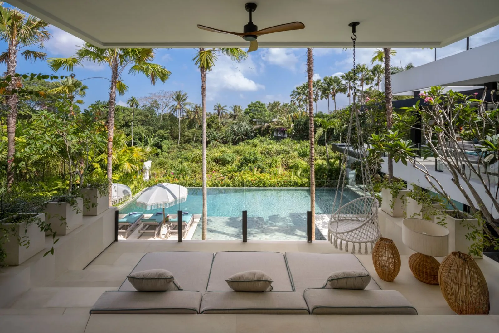 Experience the breathtaking Villa Belladonna – a fusion of modern design and tropical paradise. With stunning views of rice fields and sunsets, this five-bedroom villa is the ultimate Bali getaway. Step into the spacious atrium, surrounded by lush greenery and poolside bedrooms. The master suite boasts a luxurious ensuite bathroom, outdoor deck, and glass-base plunge pool. Ideal for families or friends, the twin rooms share a media den and bathroom. Relax in the sunken lounge by the pool, enjoy a BBQ, or unwind in the stylish bar. End your day with yoga on the rooftop or a workout in the gym. Villa Belladonna – where rest and relaxation meet luxury and style.