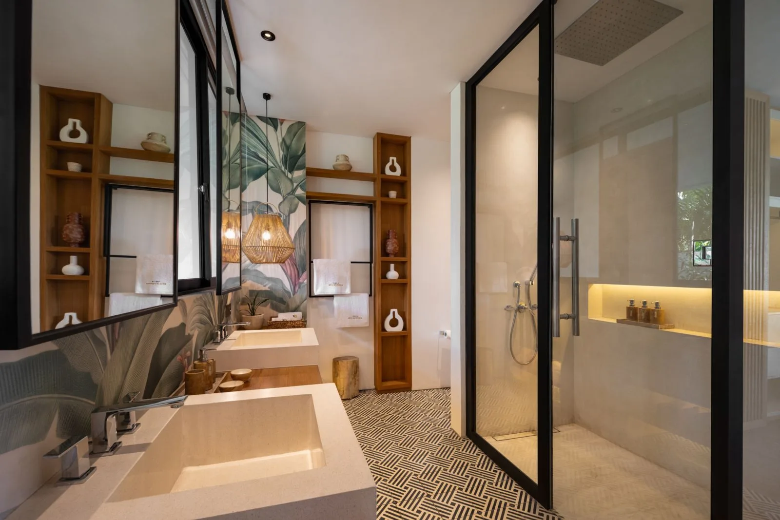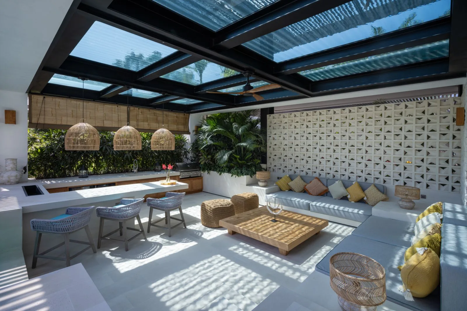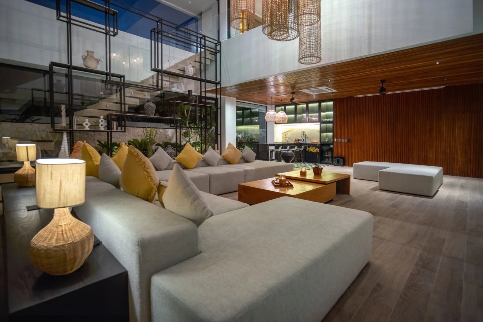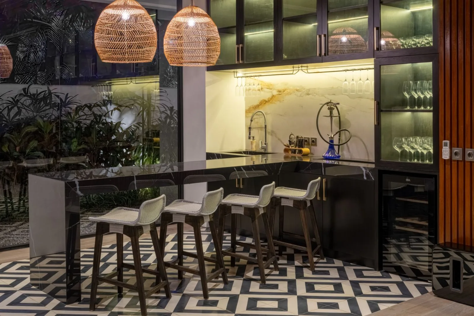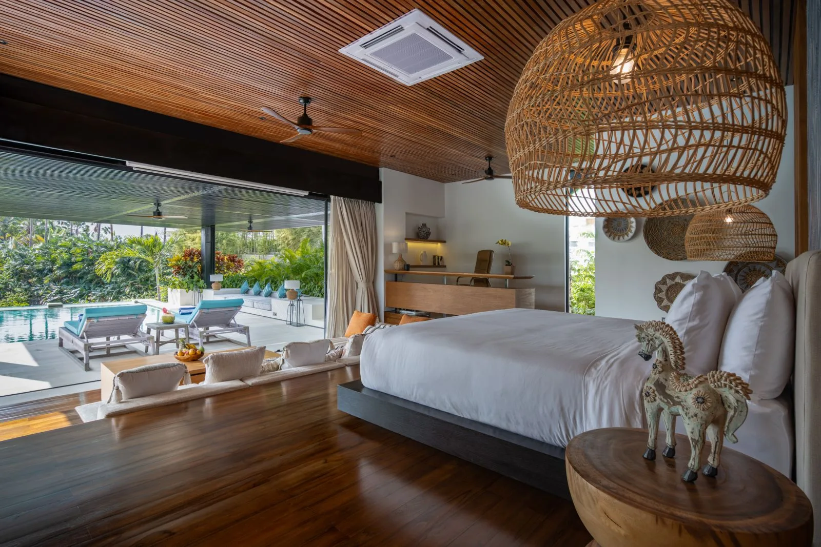 Experience the breathtaking Villa Belladonna – a fusion of modern design and tropical paradise. With stunning views of rice fields and sunsets, this five-bedroom villa is the ultimate Bali getaway. Step into the spacious atrium, surrounded by lush greenery and poolside bedrooms. The master suite boasts a luxurious ensuite bathroom, outdoor deck, and glass-base plunge pool. Ideal for families or friends, the twin rooms share a media den and bathroom. Relax in the sunken lounge by the pool, enjoy a BBQ, or unwind in the stylish bar. End your day with yoga on the rooftop or a workout in the gym. Villa Belladonna – where rest and relaxation meet luxury and style.