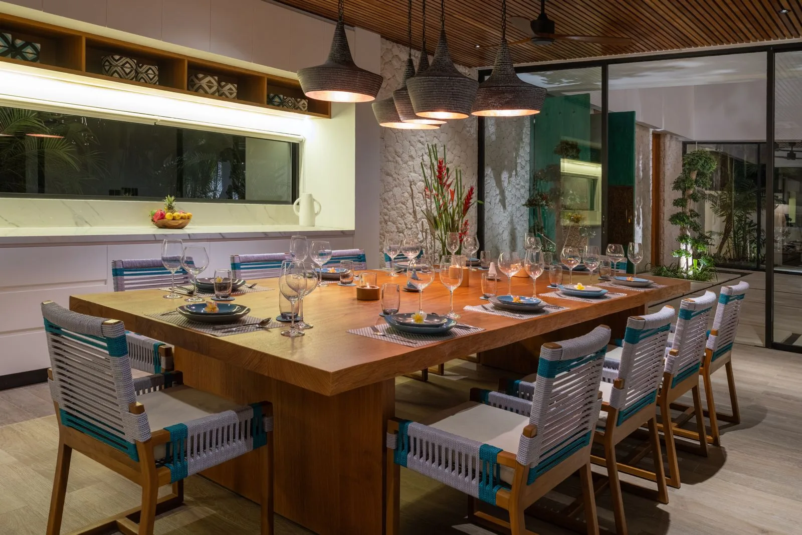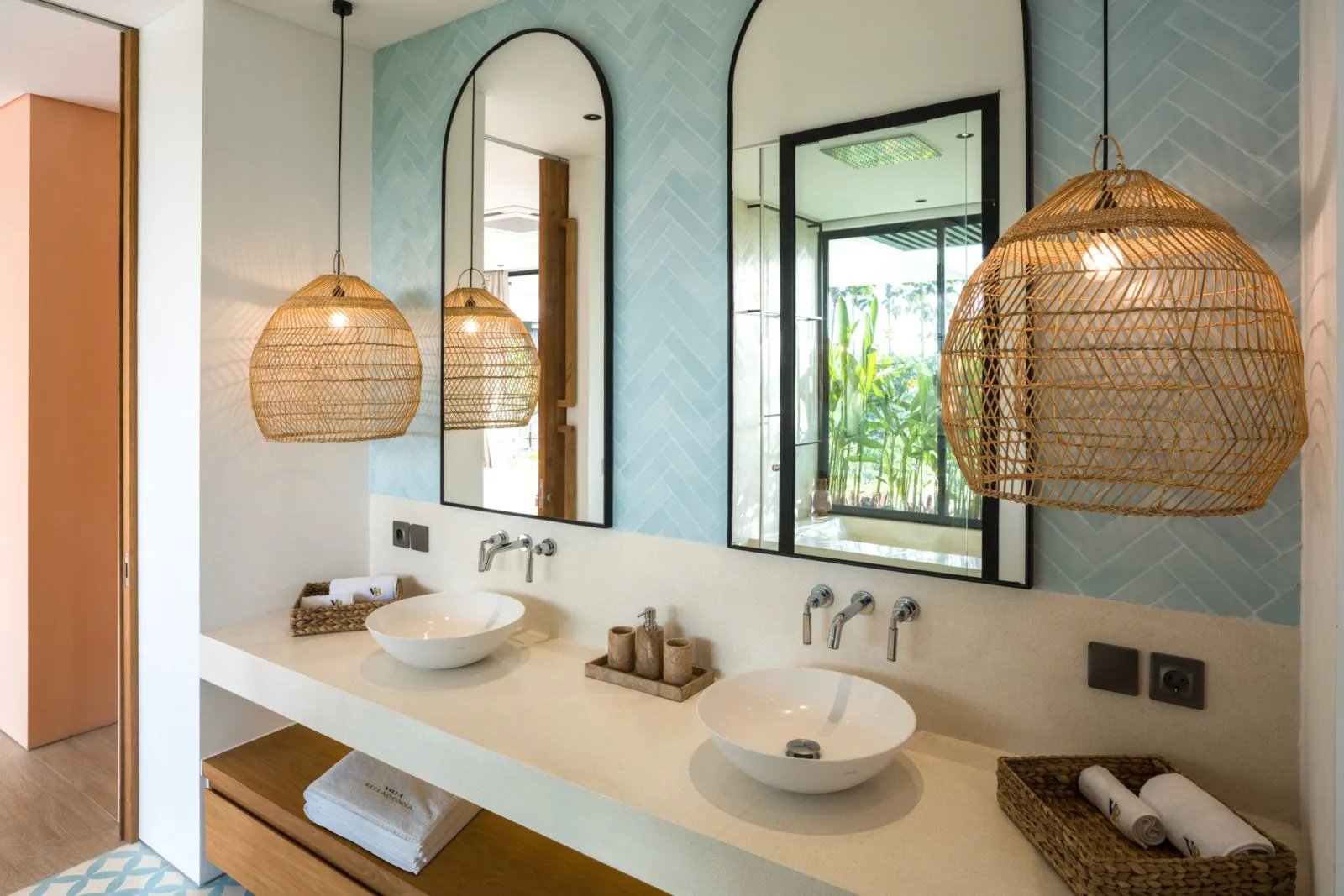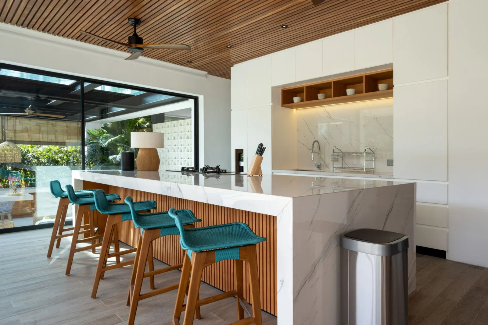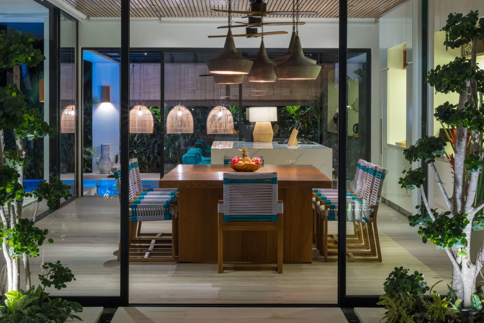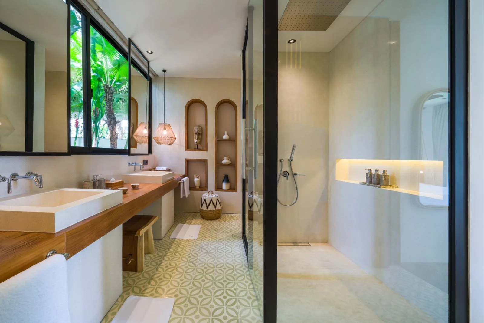 Experience the breathtaking Villa Belladonna – a fusion of modern design and tropical paradise. With stunning views of rice fields and sunsets, this five-bedroom villa is the ultimate Bali getaway. Step into the spacious atrium, surrounded by lush greenery and poolside bedrooms. The master suite boasts a luxurious ensuite bathroom, outdoor deck, and glass-base plunge pool. Ideal for families or friends, the twin rooms share a media den and bathroom. Relax in the sunken lounge by the pool, enjoy a BBQ, or unwind in the stylish bar. End your day with yoga on the rooftop or a workout in the gym. Villa Belladonna – where rest and relaxation meet luxury and style.