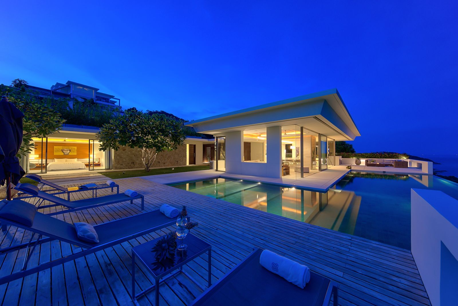 Escape to Villa Natha, a stunning five-bedroom retreat set on a hillside with panoramic views over Koh Samui’s coastline and the sparkling waters of the Gulf of Siam. Designed across three levels to maximize space and sweeping vistas, the villa blends modern luxury with tropical elegance, offering both privacy and comfort for families and groups. The upper floor hosts the main living spaces, including a bright seaview lounge, a dining room for ten, and a sleek show kitchen, all opening onto the infinity pool and sun terrace. Alfresco meals can be enjoyed on the terrace with its built-in barbecue, while the villa’s private chef also prepares tailored Thai and international dishes from a second kitchen. Each of the five bedrooms comes with breathtaking sea views, en-suite bathrooms, and refined furnishings. The two master suites feature spa-style bathrooms with twin vanities and indoor-outdoor showers. Guests can also enjoy exclusive facilities such as a private gym, a cinema room with surround sound, and multiple lounge areas for relaxation. With attentive staff, daily housekeeping, and a dedicated villa manager, every stay at Villa Natha promises style, comfort, and complete indulgence.